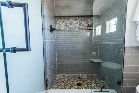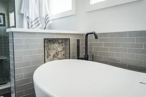Design updates in this transitional style home focused on improving usability and spatial design in the kitchen and bathroom. The bathroom remodel resulted in an improved layout that feels bigger and functions better, and introduced beautiful textures to enrich the entire aesthetic of the space.